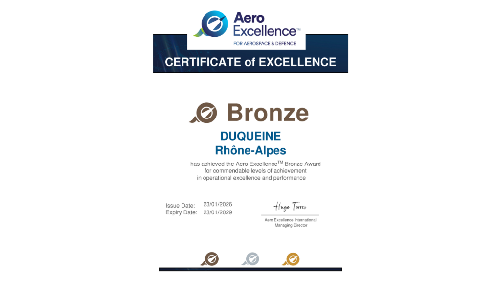 Nous sommes particulièrement fiers d’annoncer que notre site DUQUEINE Rhône-Alpes a obtenu le label Aero Excellence™ Bronze, une reconnaissance internationale qui souligne la maturité de nos pratiques et l’engagement collectif de nos équipes, au cœur de l’ADN industriel de DUQUEINE Group.